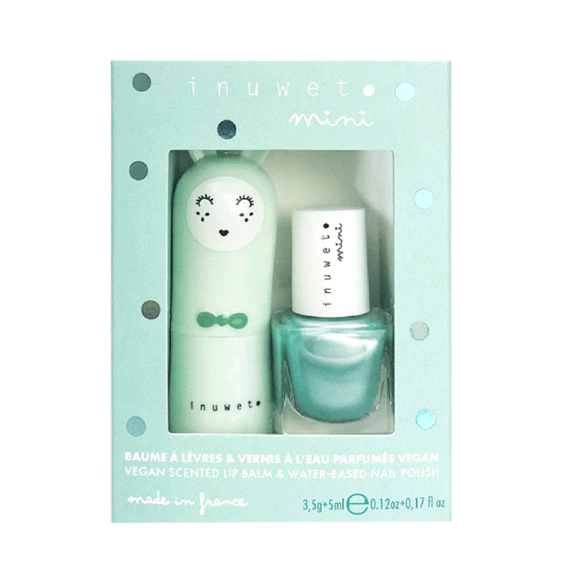 A set for minis! Nourishing, scented lip balm, enriched with shea butter and macadamia oil for intense lip hydration all day long. Scented water-based nail polish for kids, made with 82% water and without controversial ingredients to respect minis. Sweet, gourmand strawberry scent for lips, pink nail polish. Natural formulas and 100% Vegan & Made in France.