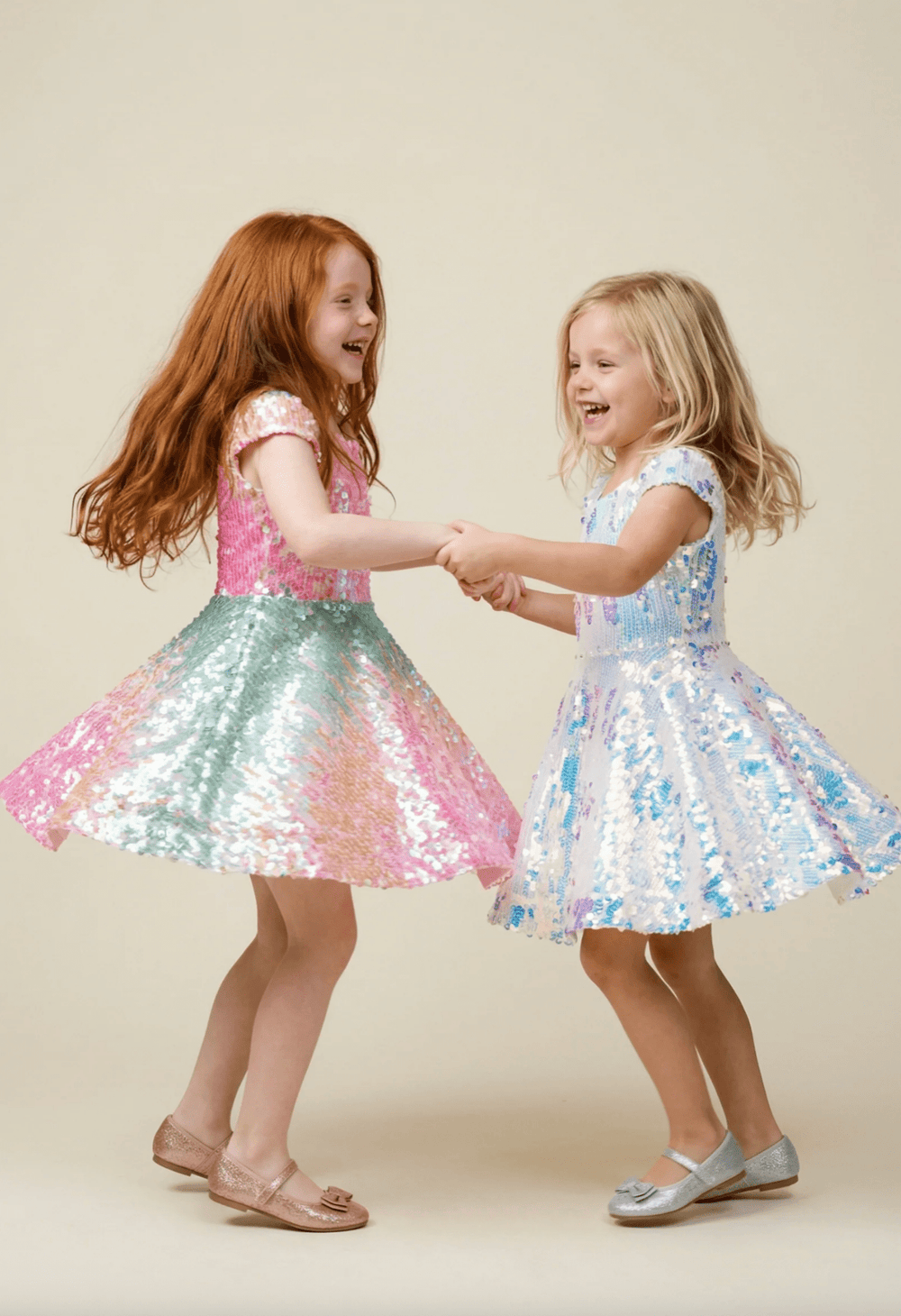The playful skater silhouette makes this dress ideal for dancing, cartwheels, and full-spin fun. Layers of iridescent sparkles cascade from top to hem in a stunning ombré that blends juicy pinks, refreshing blues, and sunny orange tones, just like a perfect scoop of rainbow sorbet. Every move sets the sparkles shimmering, creating a magical swirl of colour and light.
