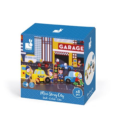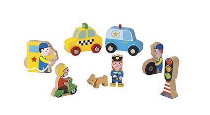 Explore the different parts of the city and create infinite stories with the vehicles and people. Contains 1 policewoman, 1 gas station attendant, 1 garage owner, 1 scooter, 1 dog, 1 set of traffic lights, 1 police car, 1 taxi. 8 solid wood pieces (beech).