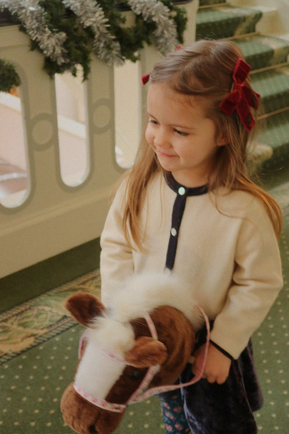 Soft 100% wool cardigan with bow detailing. Classic design with round neck, contrast edges, and mother of pearl buttons.