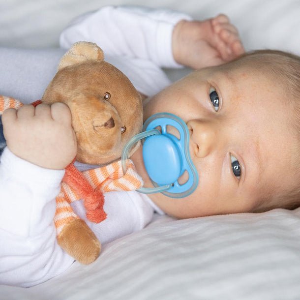 Meet Mavi Blankie! He is made out of a special plush that is incredibly soft to the touch and the perfect gift for a newborn! The blanket is blue corduroy with yellow patches and a striped white and orange trim. The inside of the blanket is white with a velcro pacifier holder. Mavi Blankie has a blush scarf as a finishing touch.
